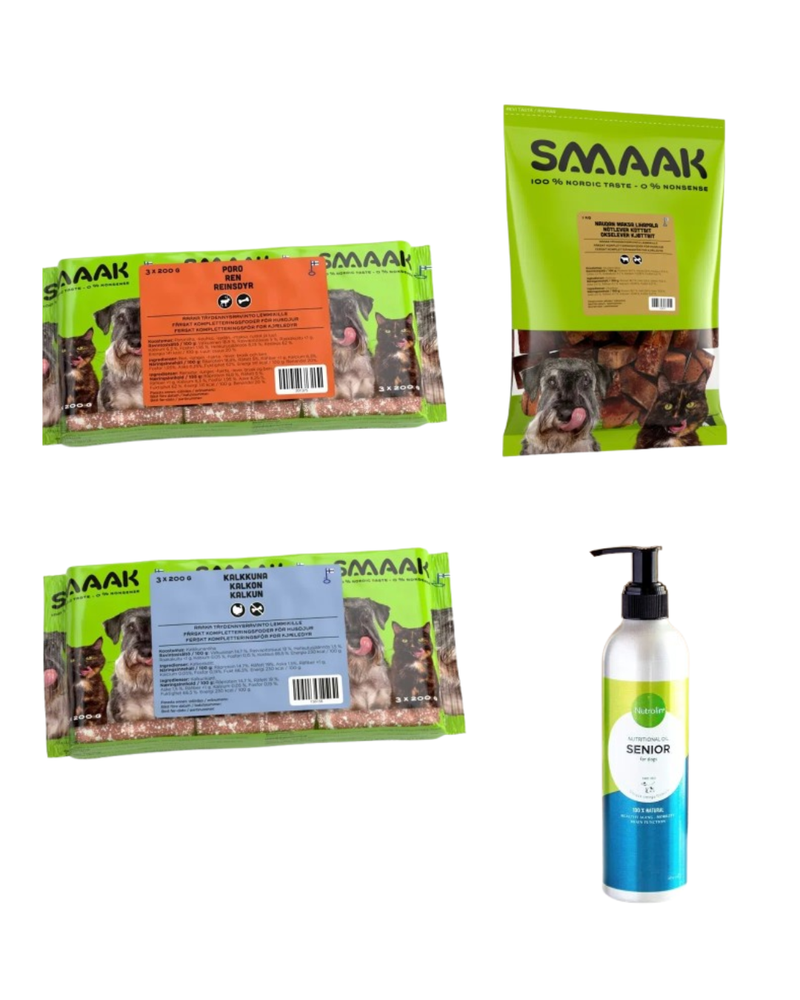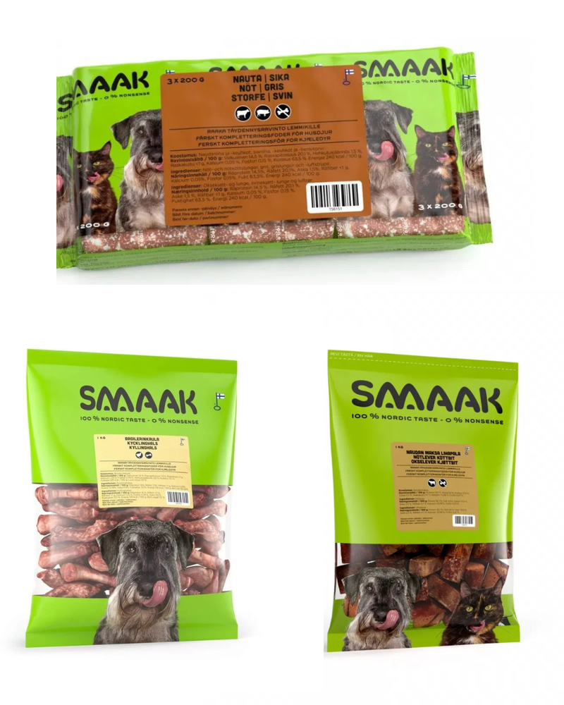 💡 Huomio kauppareissulle: Täysravinto vai pelkkä liha?Tämän oppaan ostoslistat perustuvat ns. täydennysravintoihin (esim. SMAAK Sika-nauta tai MUSH Basic Sika-Nauta). Nämä tuotteet sisältävät pääosin lihaa, rustoa ja rasvaa, mutta eivät ole ravitsemuksellisesti täysipainoisia – niistä puuttuu usein luu (kalsium), maksa (A-vitamiini) ja/tai tärkeitä hivenaineita. Kun ostat näitä edullisia peruslihoja, pääset itse koostamaan aterian täydelliseksi lisäämällä oppaamme mukaiset luut, maksan ja vitamiinit! (Huom. Varo sekoittamasta näitä valmiisiin "täysravintoihin" kuten MUSH Vaisto -sarjaan, joihin on jo lisätty maksa ja luut).